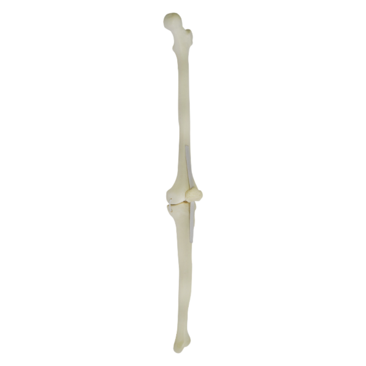 Com fêmur esquerdo, tíbia esquerda e patela, o conjunto apresenta camada cortical, osso esponjoso e canal medular, além de estar unido por simulação dos ligamentos colaterais (medial e lateral) e cruzados (anterior e posterior). Isso permite executar cortes, perfurações e fixações com instrumentais cirúrgicos reais, replicando a resistência.